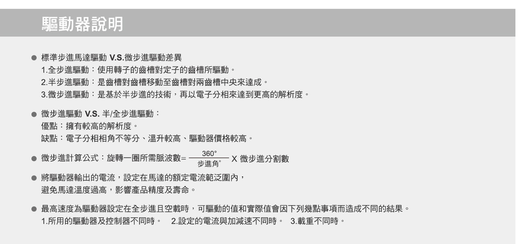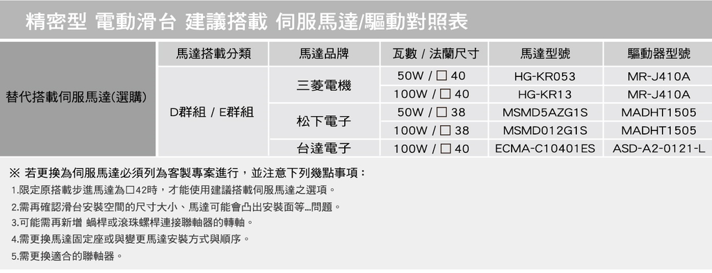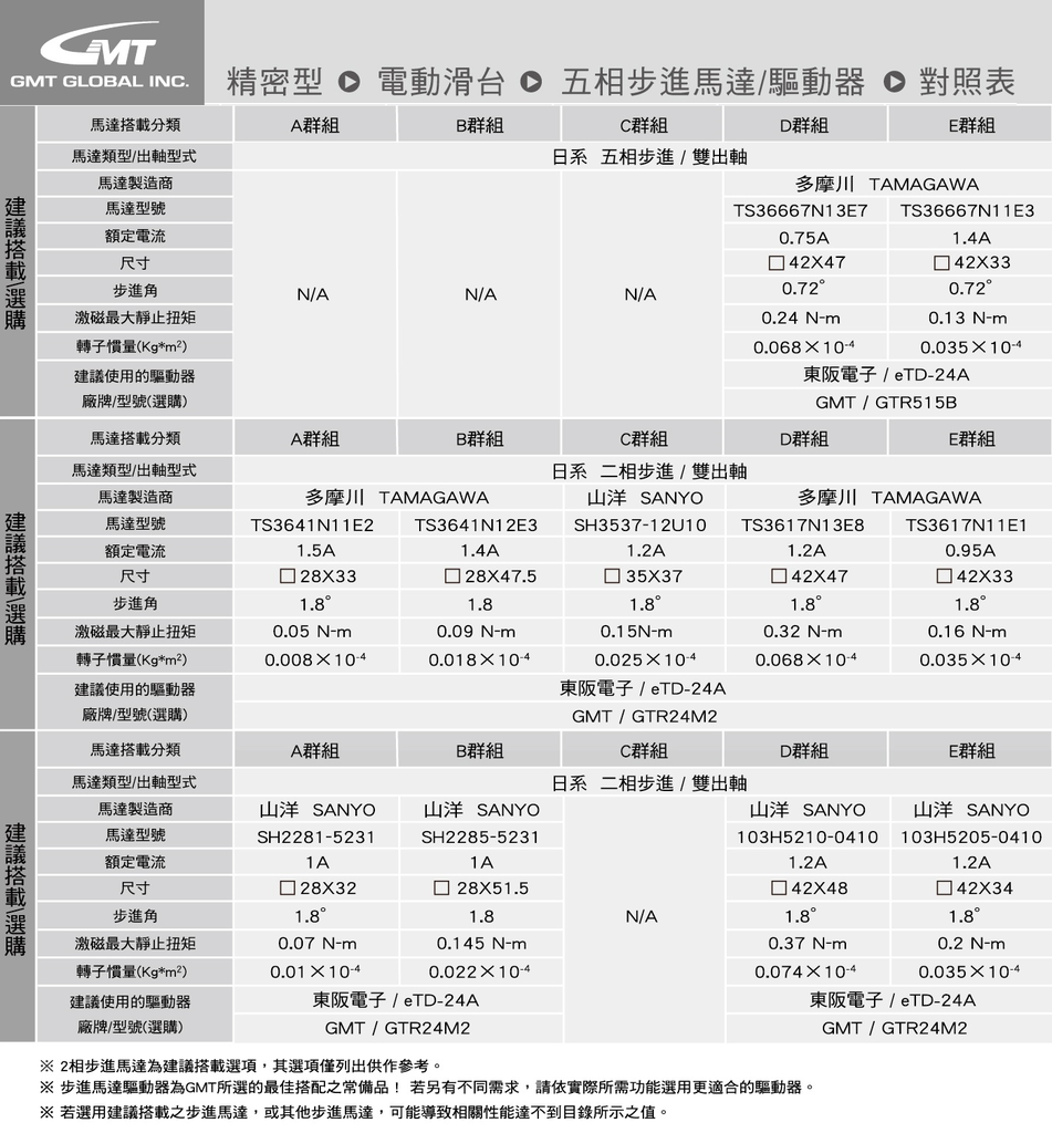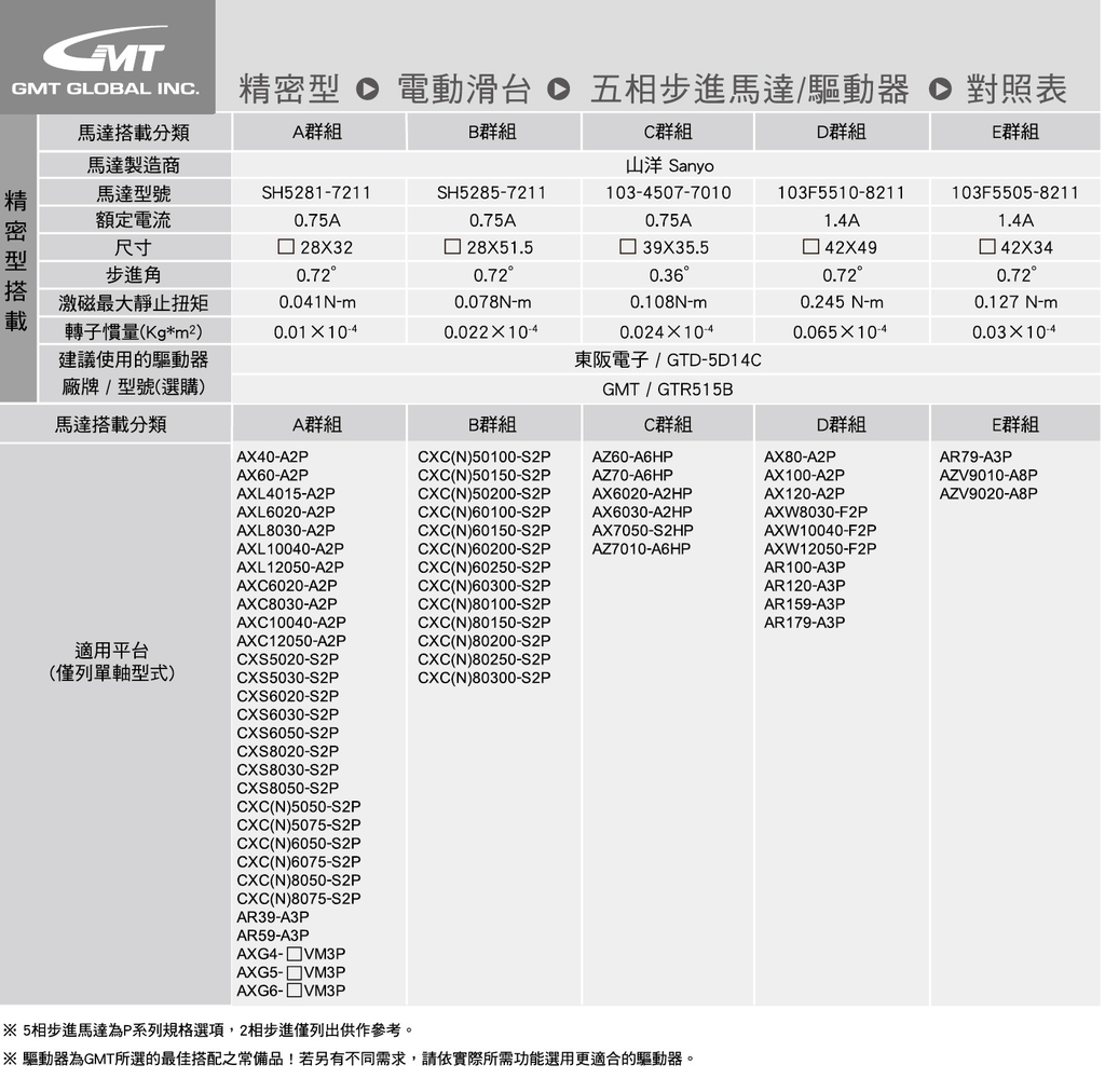 GMT 精密型電動滑台 五相步進馬達/驅動器 對照表