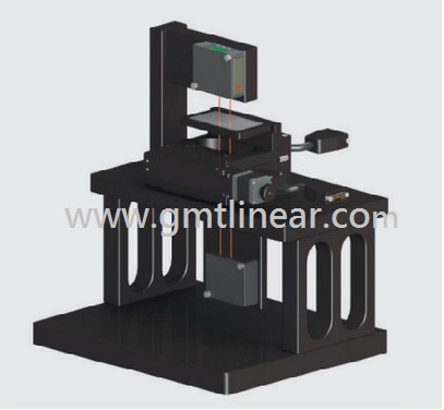 此產品應用範例主要運用中精密電動滑台AYC-台面上的中空以及兩台感測器來去做一個組合延伸,主要是透過2級雷射紅光來量測玻璃厚度,且能夠運用在手機玻璃或者其他薄膜產品量測上。此組合產品,上下皆設有感測器,感測器各有發射以及接收端;並且在下圖可看到兩條雷射紅光光束,透過台面上的中空能夠使光線穿透。