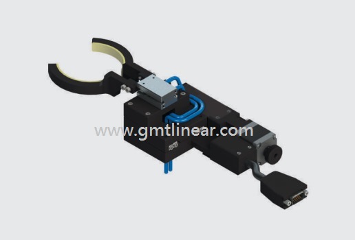 將夾爪安裝在一中空直動滑台上,為了使夾爪運作,藉由氣壓管傳送壓縮空氣,使達到夾取功能。其中,複雜的配管可藉由中空型的設計從台體貫穿而出,無須再經由外部裝配顯得雜亂不易整理。