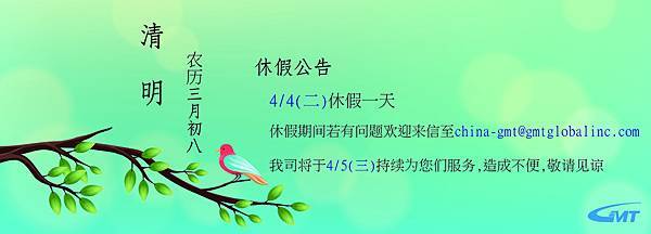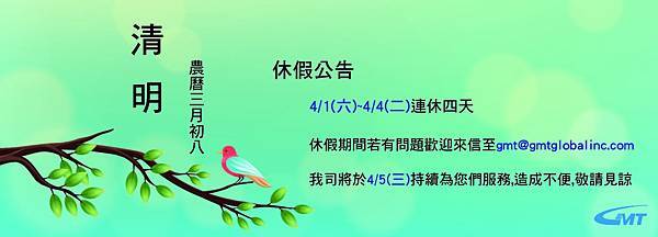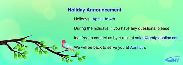 休假期間若有問題歡迎來信至gmt@gmtglobalinc.com,